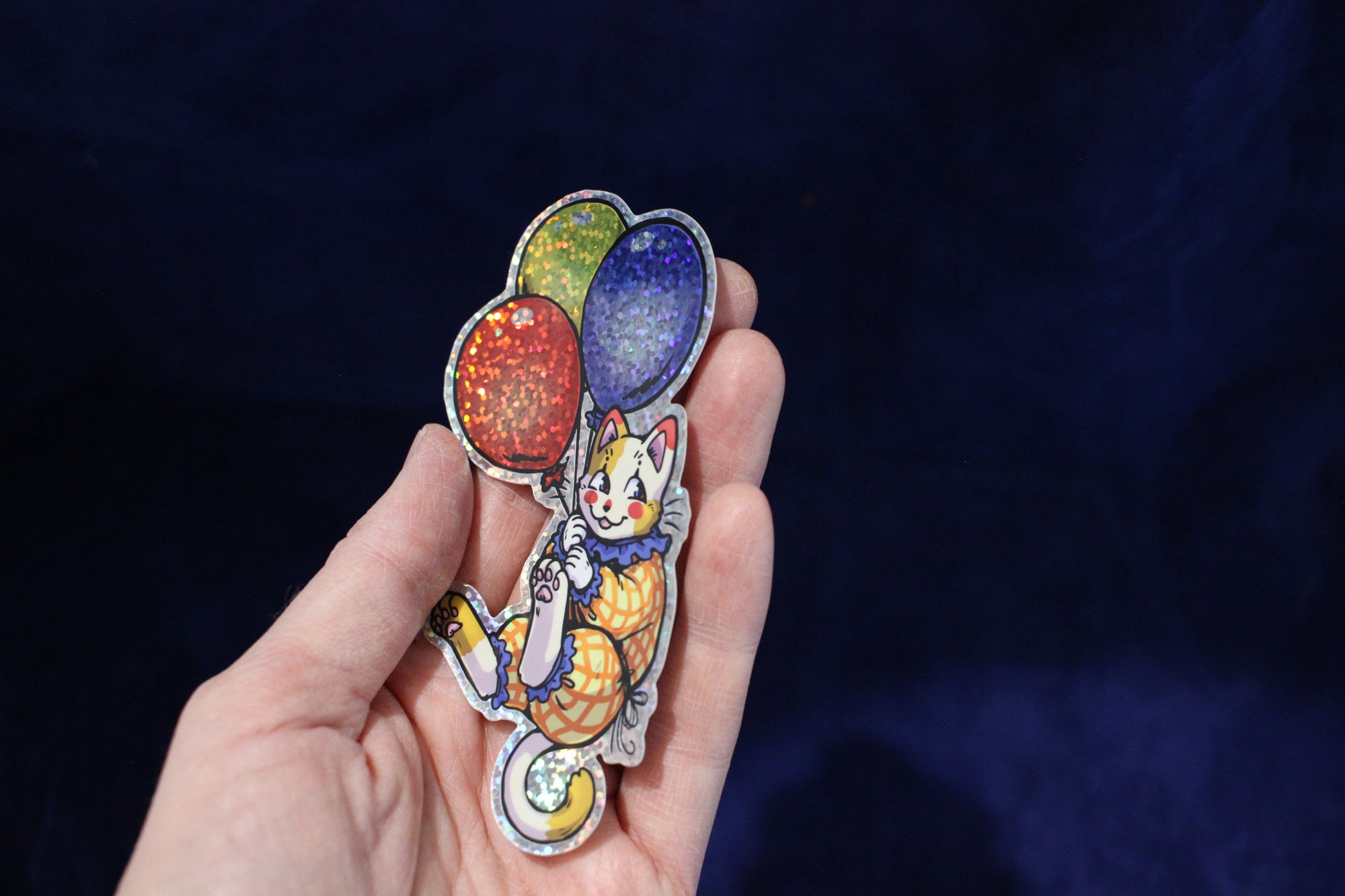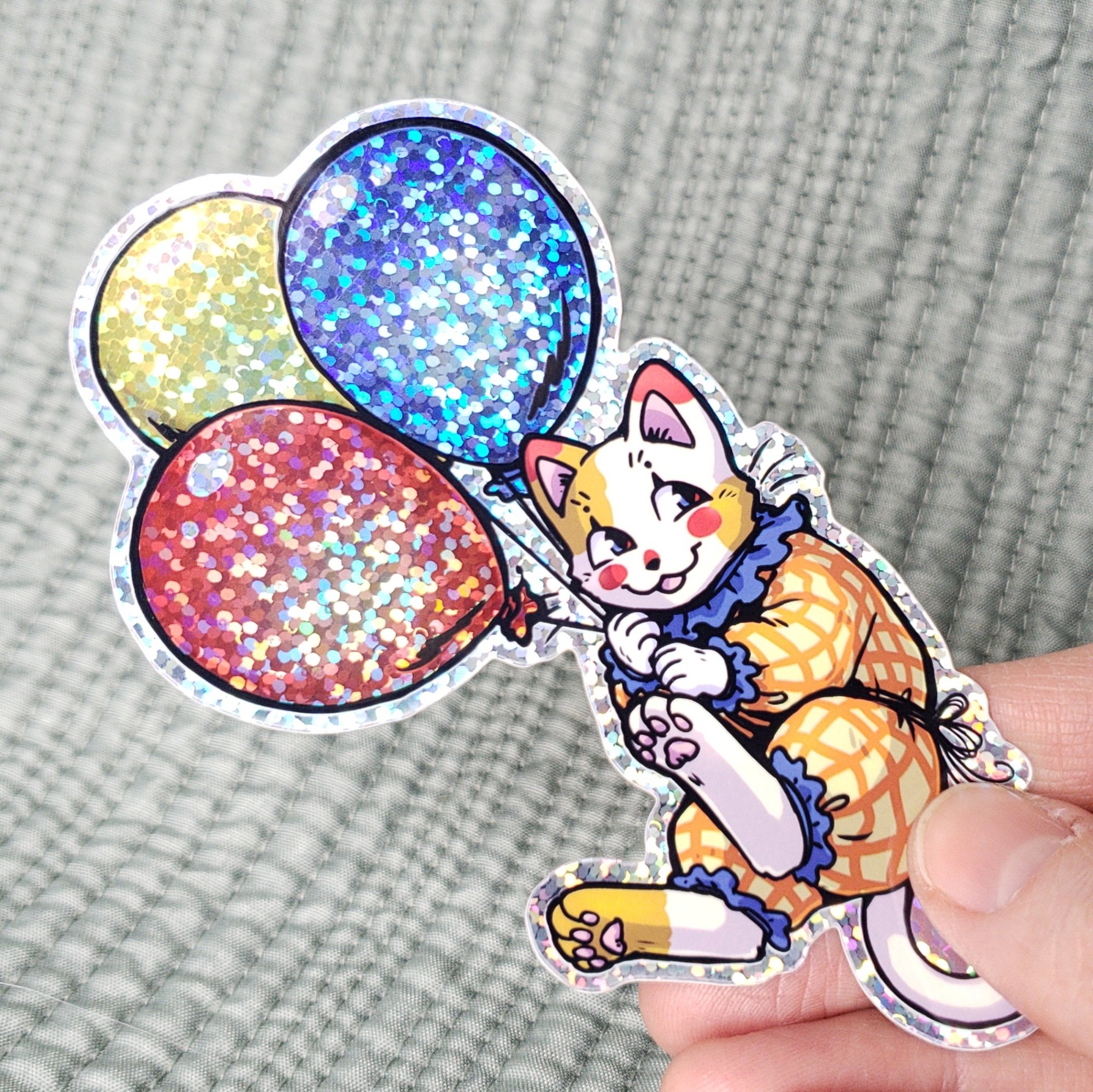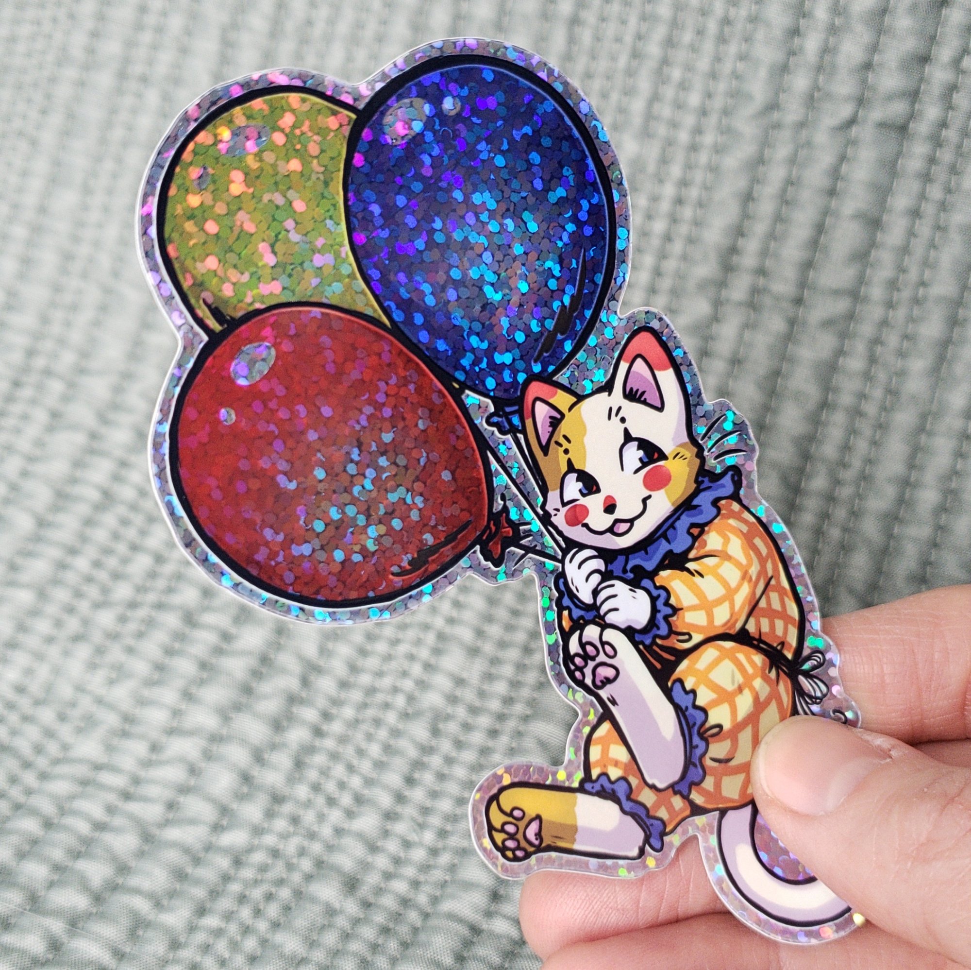 A clown kitty floating away with some balloons with a glittery shimmer, this durable water-proof vinyl sticker is 2.3" x 4.4".
