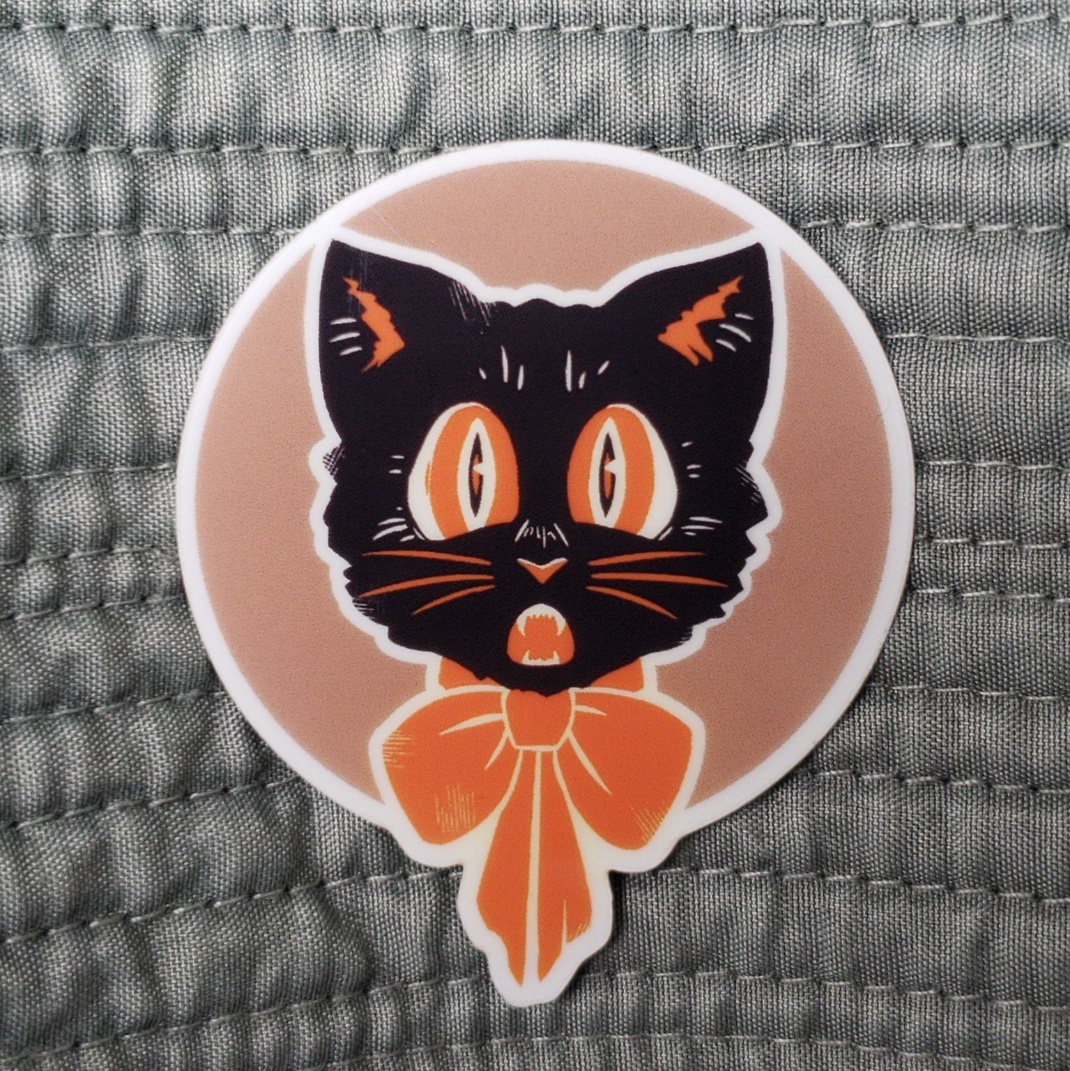 Waterproof vinyl, 2.5x2 Glow-in-the-dark sticker featuring a cat based on vintage Halloween decorations.