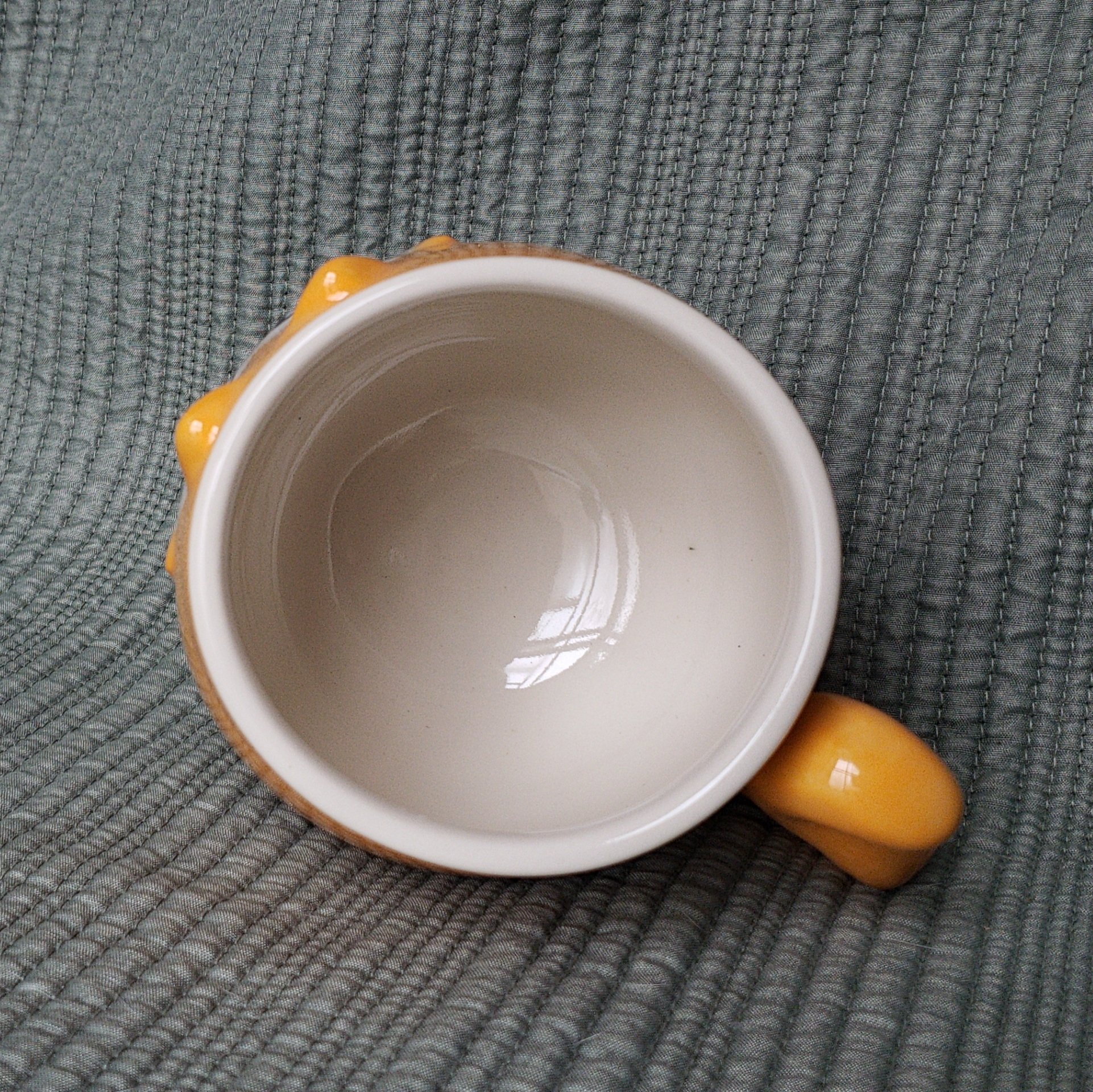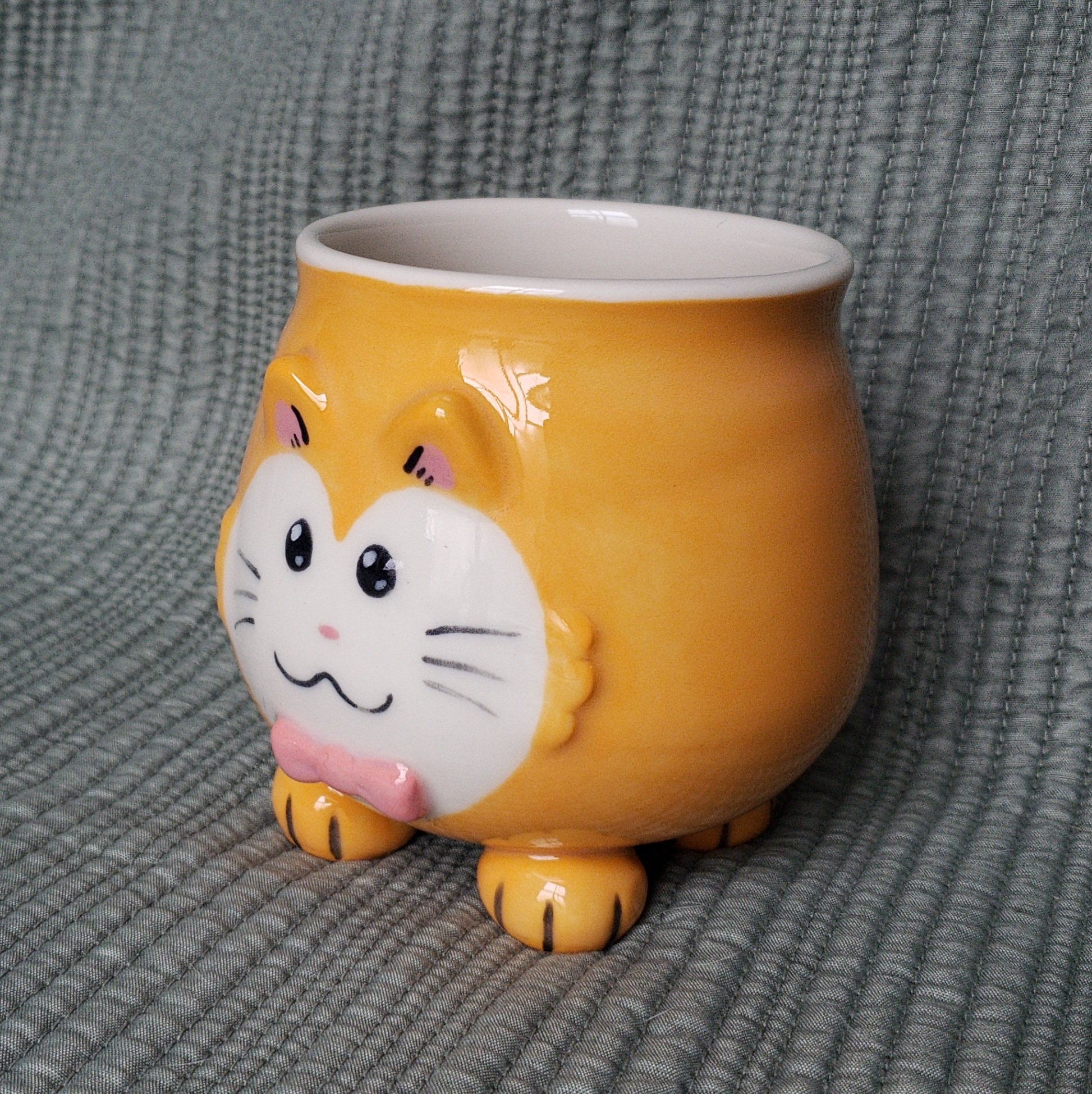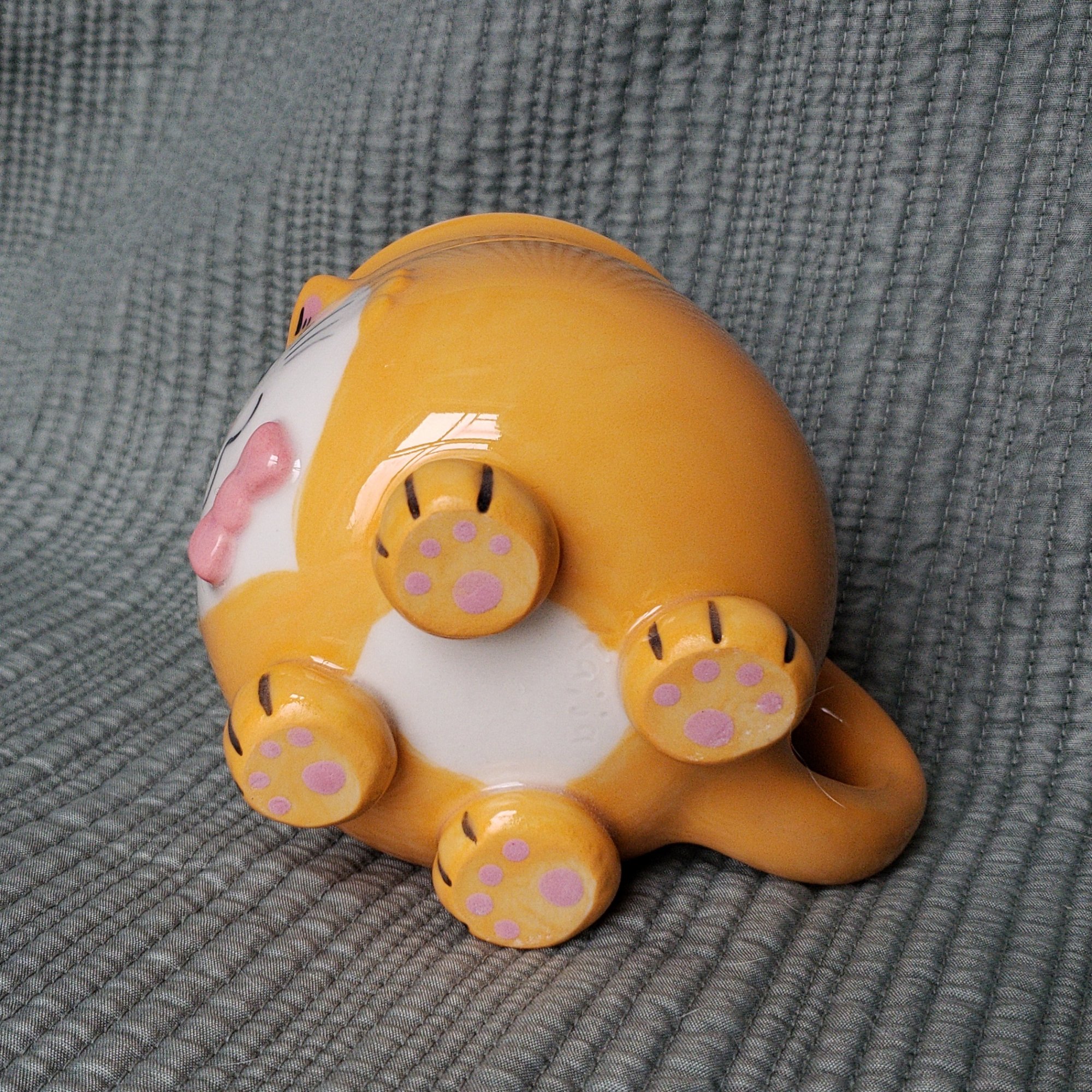 A silly kitty mug! This one is a sweetheart with it's white face pattern being a heart shape and it has a little pink bow-tie, it is average size at 4x5x4 inches, and 1lb + 0.9oz and holds 15oz comfortably.