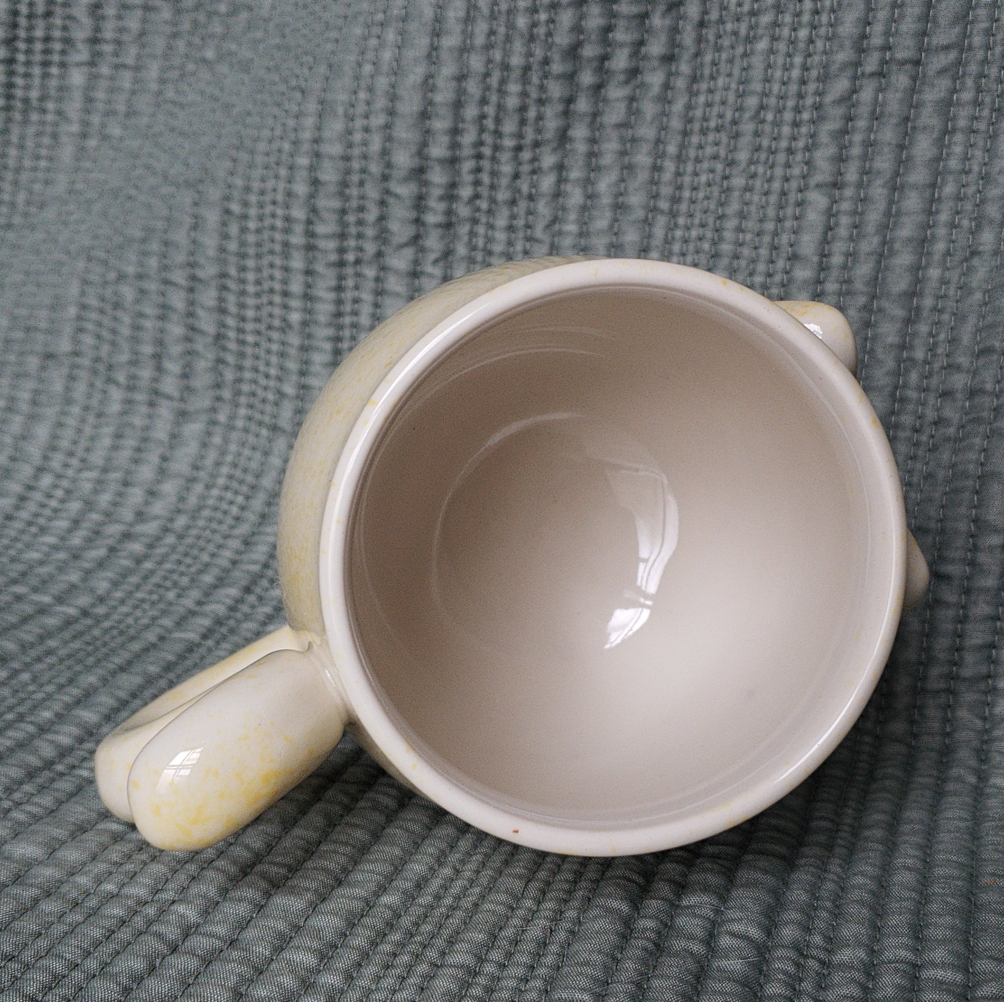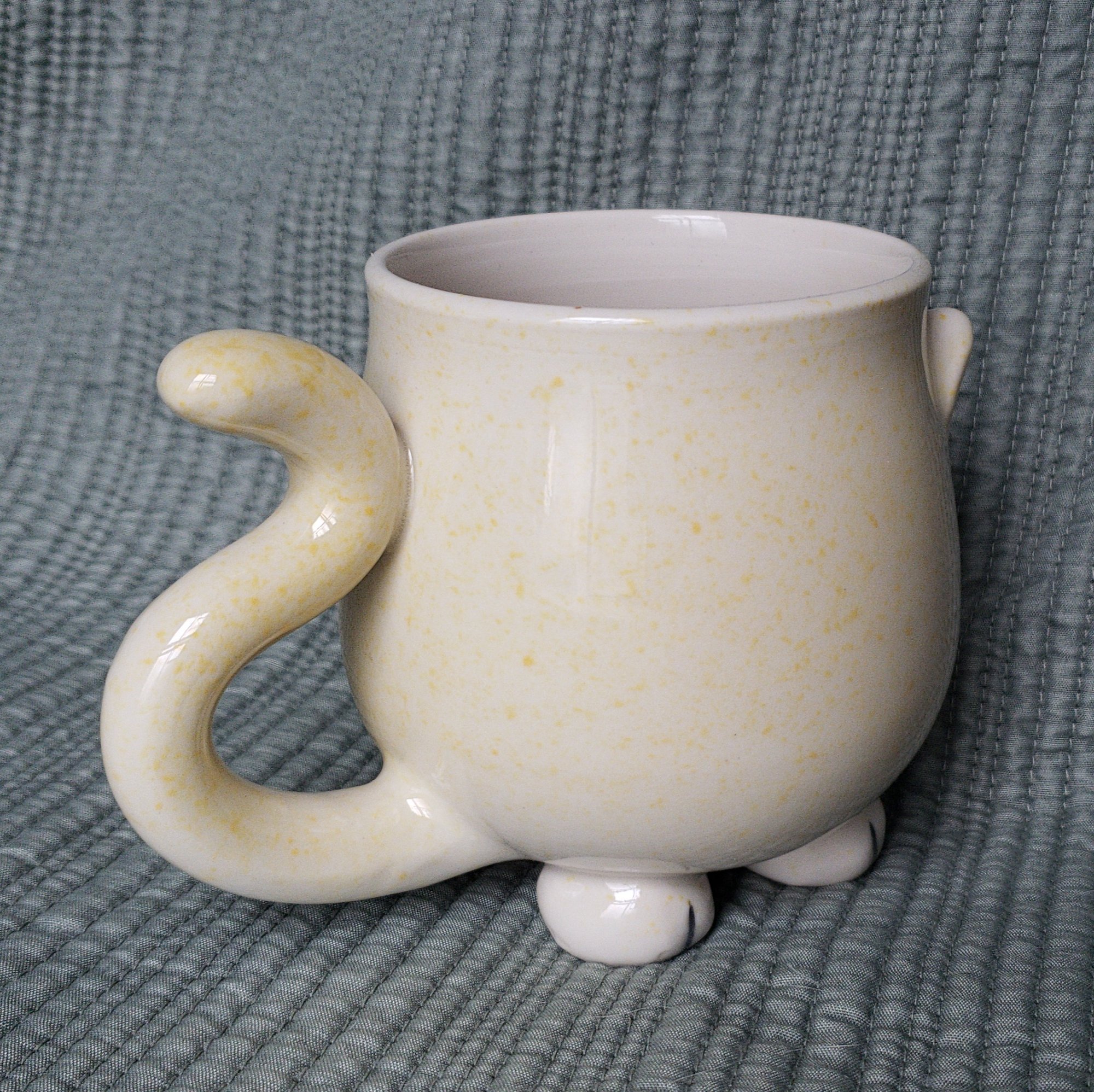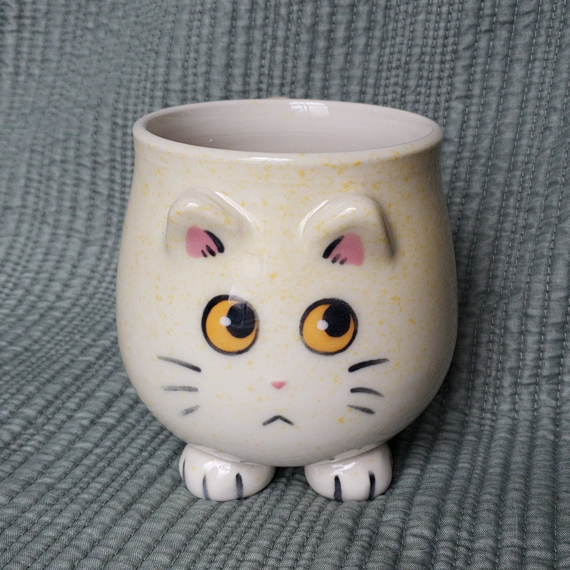 A silly kitty mug! Wide orange eyes and a light yellow speckling this one is 4x5.5x3.75 inches, it is 1lb and 2oz and holds 14oz comfortably.
